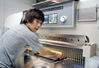 裁断、打ち抜き、バンドナイフ、人絹カット、トムソン、糊引加工、センター合せ、罫線入れ、定期窓抜きシート